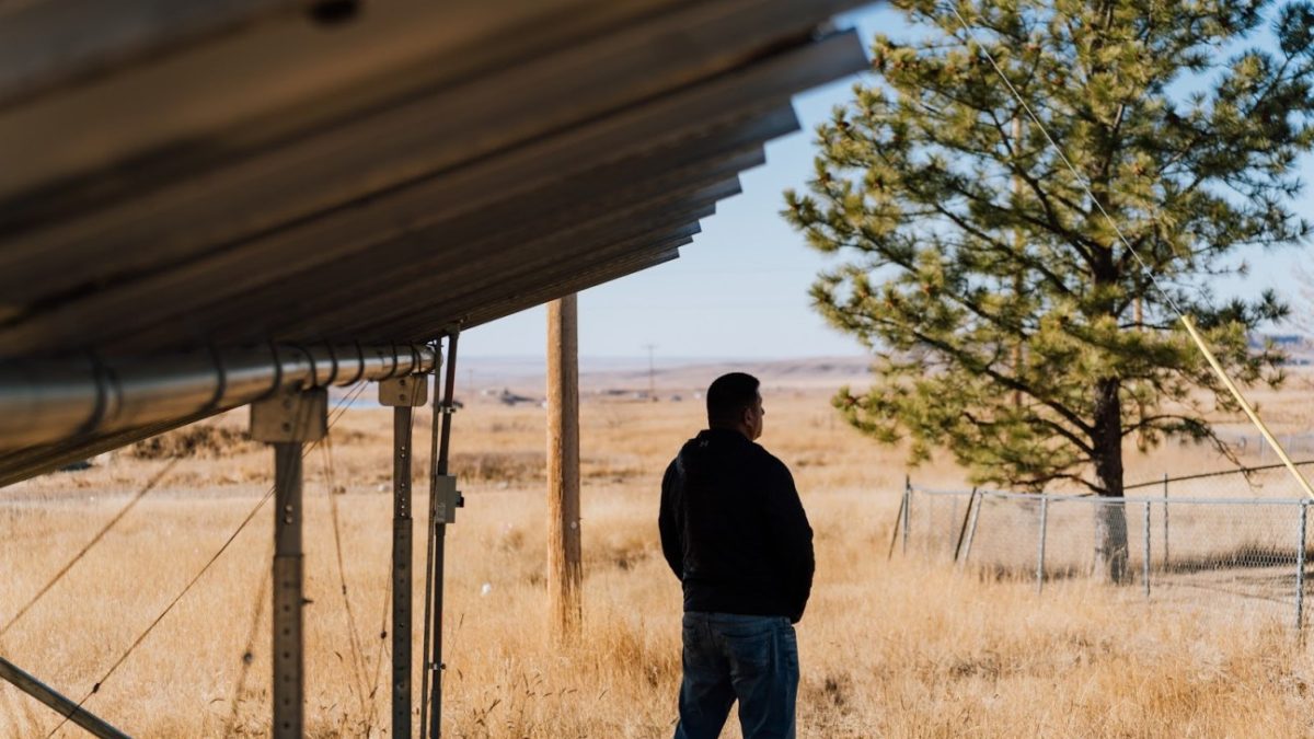 Joseph Eagleman, standing beneath the solar array, looks out onto the Rocky Boy’s Reservation.